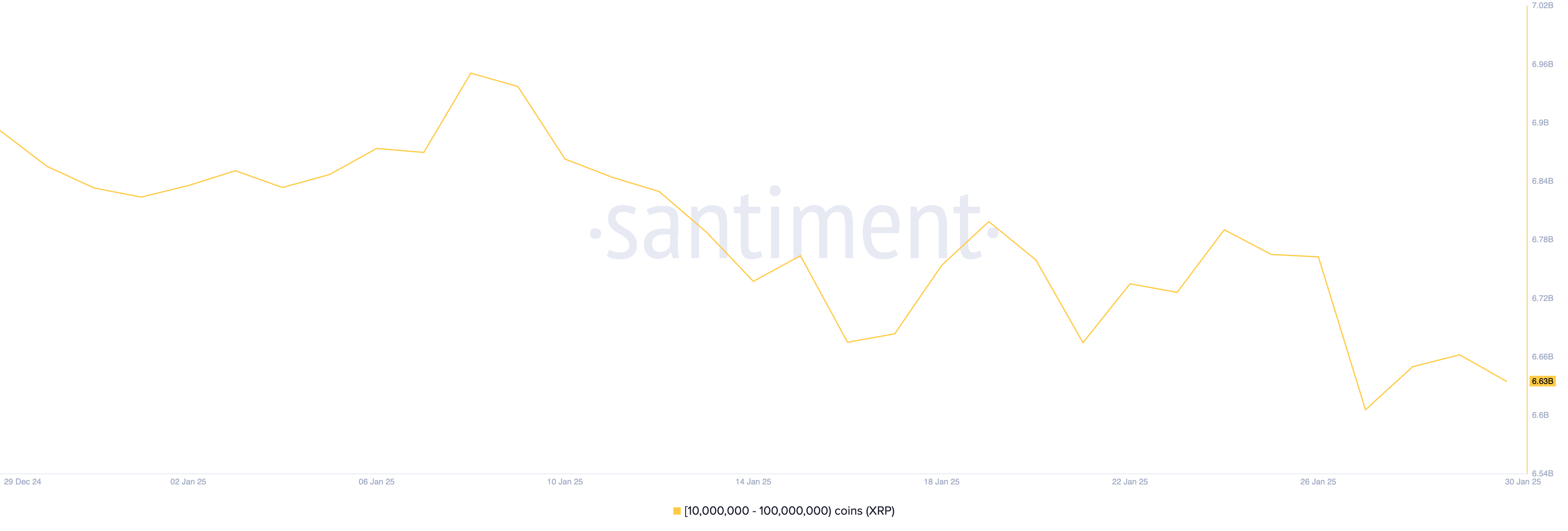 Dagdag pa, ang mga aksyon ng XRP whales ay maaaring mag-contribute sa downward pressure na ito. Ayon sa Santiment, ang mga XRP whale addresses na may hawak na 10 million hanggang 100 million tokens ay nagbawas ng kanilang holdings ng 1% mula nang maabot ang all-time high. Sa nakaraang buwan, ang grupong ito ng malalaking investors ay nagbenta ng 60 million XRP na nagkakahalaga ng higit sa $180 million.