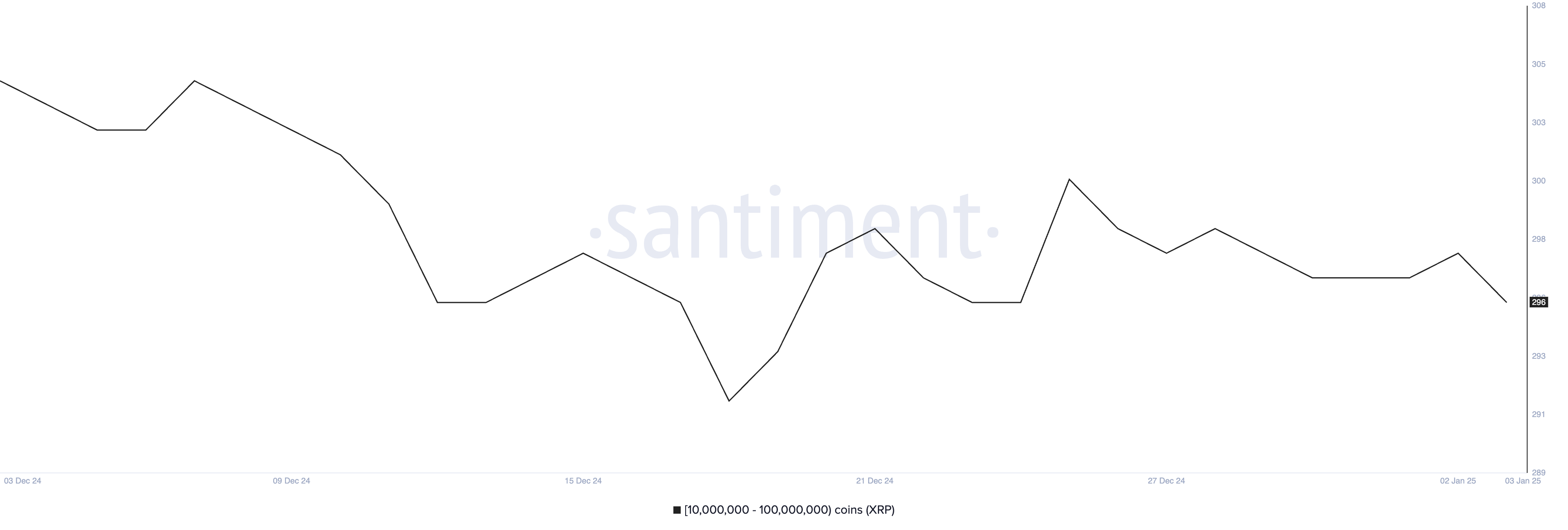 Ang bilang ng mga XRP whales na may hawak na nasa pagitan ng 10 million at 100 million XRP ay bumaba sa 296, ang pinakamababang level mula noong December 24. Pagkatapos maabot ang 301 noong December 25, nagsimula nang bumaba ang bilang ng mga malalaking holder na ito.