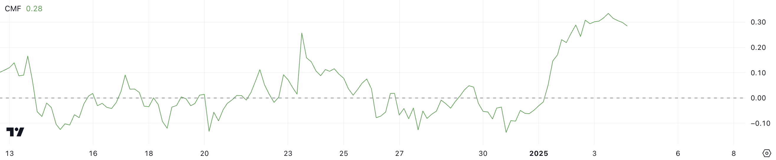 Ang XRP Chaikin Money Flow (CMF) ay kasalukuyang nasa 0.28, nananatiling positibo mula noong January 1, kung saan ito ay halos nasa 0. Ang CMF ay nagpakita ng upward trend sa bagong taon, na nagsa-suggest ng pagtaas ng capital inflows habang mas malakas ang buying pressure kaysa sa selling pressure.