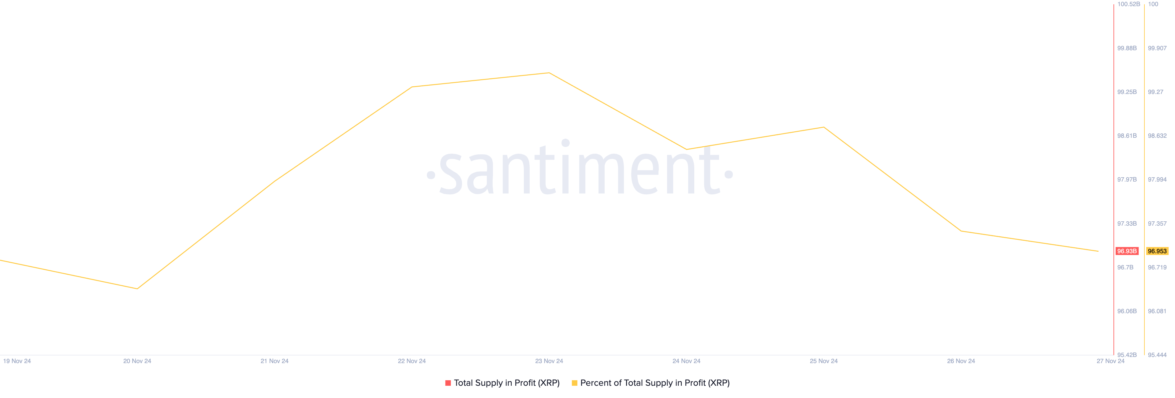 Ang porsyento ng XRP supply na nasa profit ay kamakailan lang lumampas sa 90%. Ibig sabihin, karamihan sa mga XRP holders ay kumikita na ngayon. Sa kasalukuyan, halos 97% ng circulating supply ng token na 99 billion ay nasa profit.