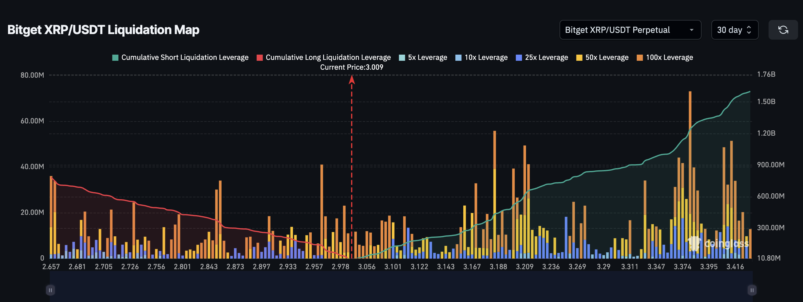 Ipinapakita ng liquidation data ng XRP mula sa Bitget na mas marami pa rin ang short positions sa market. Umabot sa $1.6 billion ang short positions, habang nasa $784 million lang ang longs. Ibig sabihin, kung biglang tumaas ang presyo, maraming shorts ang pwedeng ma-liquidate, na magreresulta sa classic na short squeeze. Sa kasalukuyang presyo na malapit sa $3.00, ang pag-angat ng 10% hanggang 14% ay pwedeng mag-trigger ng squeeze hanggang $3.40.