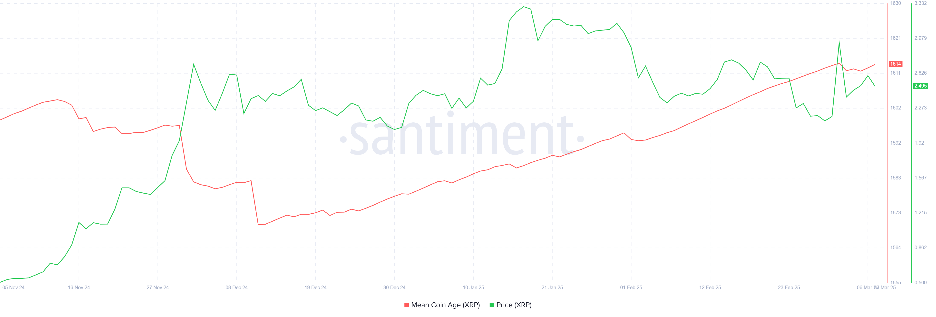 Ang Mean Coin Age (MCA) para sa XRP ay hindi nagpakita ng matinding pagbaba, na nagpapahiwatig na ang mga long-term holders ay patuloy na hawak ang kanilang mga posisyon sa kabila ng kamakailang market volatility. Ang mga investor na ito, na matagal nang nagho-hold, ay hindi nagbenta sa nakaraang mga araw, na nagpapakita ng kumpiyansa sa isang future price recovery.