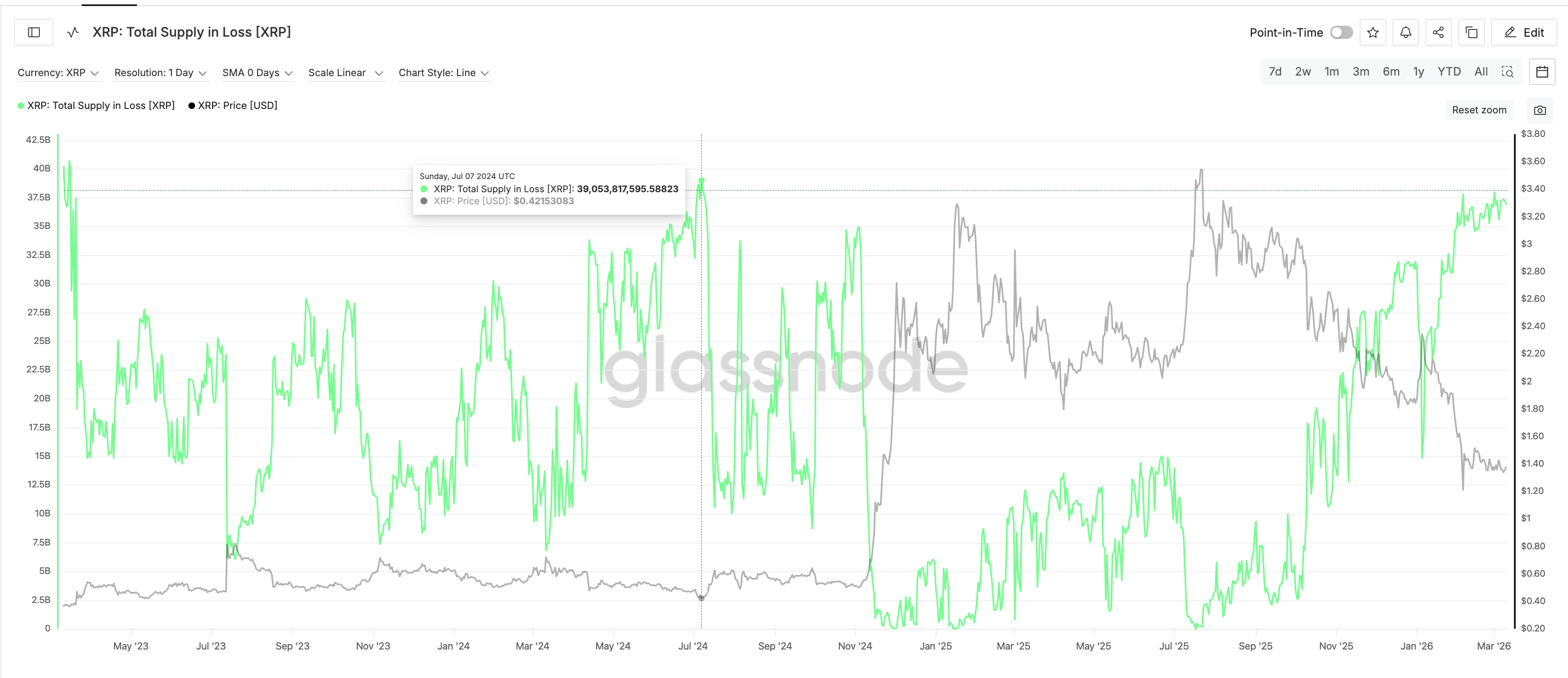 On-chain data may dagdag pang clue kung bakit nababawasan ang activity ng investors. Ayon sa Glassnode, umabot sa halos 37.9 billion XRP tokens ang nasa loss ngayon. Ang “supply in loss” ay sukat kung ilang coins ang huling nagalaw sa presyong mas mataas kaysa sa kasalukuyang value ng market.