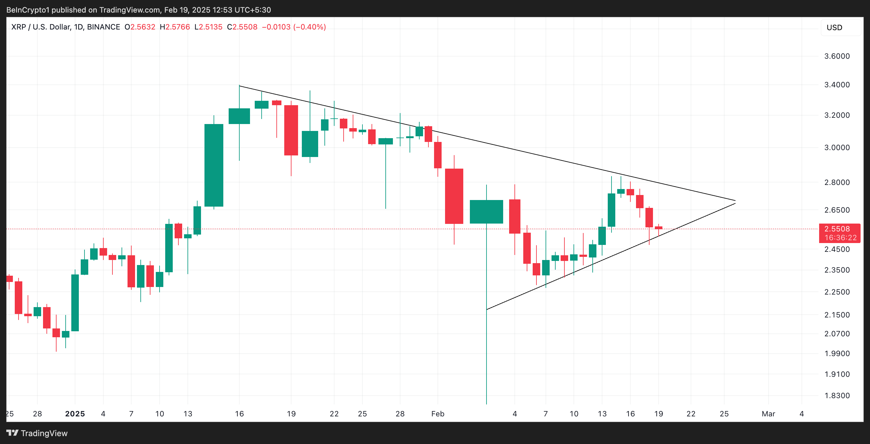 Ang pag-assess sa XRP/USD one-day chart ay nagpapakita na ang altcoin ay nag-trade sa loob ng isang symmetrical triangle pattern mula nang maabot nito ang all-time high (ATH) na $3.39 noong Enero 16. Ang pattern na ito ay nabubuo kapag ang presyo ng asset ay nag-trade sa loob ng dalawang nagko-converge na trendlines, na nagpapahiwatig ng yugto ng consolidation at pagbaba ng volatility.