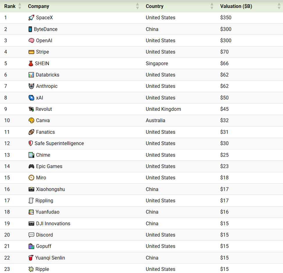 Ayon sa data, kabilang ang Ripple sa mga pinakamahalagang private companies sa mundo, kahit na may iba pang crypto firms na nasa listahan din.