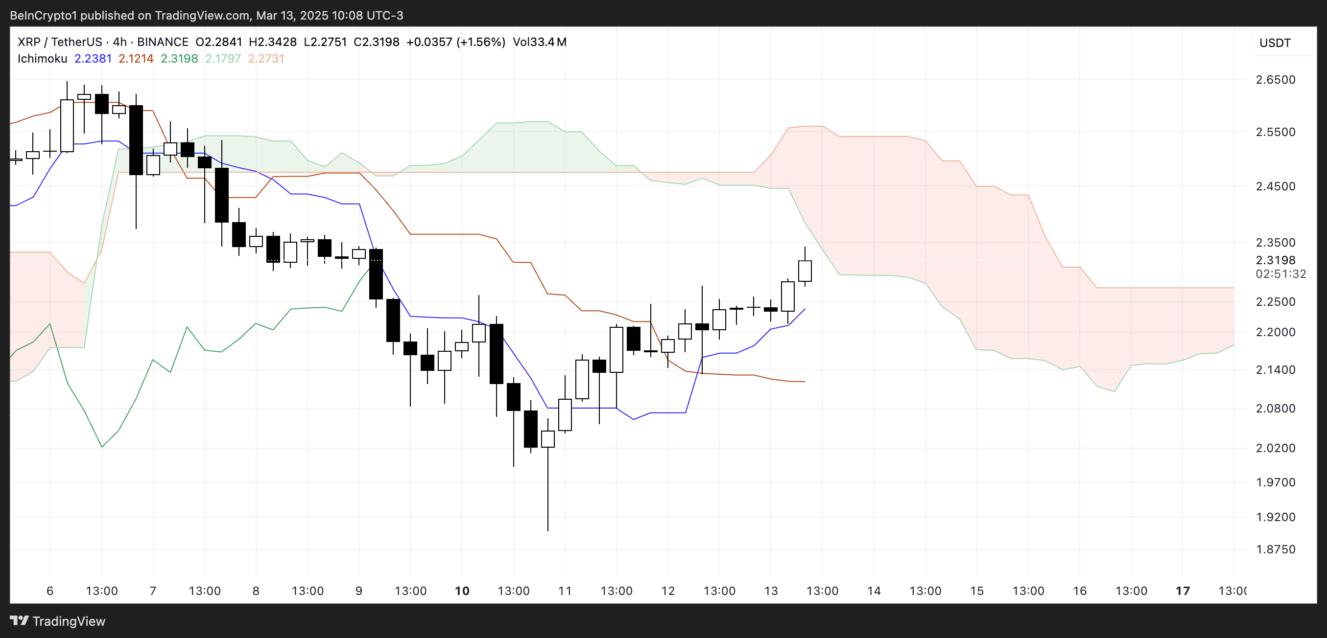 Ang Ichimoku Cloud chart para sa XRP ay nagpapakita na ang price action ay kamakailan lang lumampas sa blue Tenkan-Sen (conversion line), na nagsa-suggest ng short-term bullish momentum.
