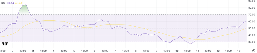 Ang Relative Strength Index (RSI) ng XRP ay umakyat nang malaki sa 60.14, mula sa 27 tatlong araw lang ang nakalipas. Ang RSI ay isang momentum oscillator na sumusukat sa bilis at magnitude ng mga kamakailang pagbabago sa presyo sa isang scale mula 0 hanggang 100.