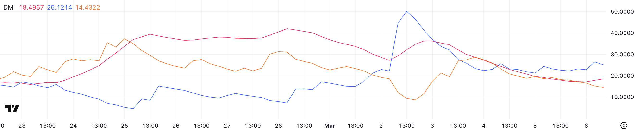 Ang +DI (positive directional index) ay nasa 25.1, bumaba mula sa 50, habang ang -DI (negative directional index) ay tumaas sa 14.4 mula sa 9.3.