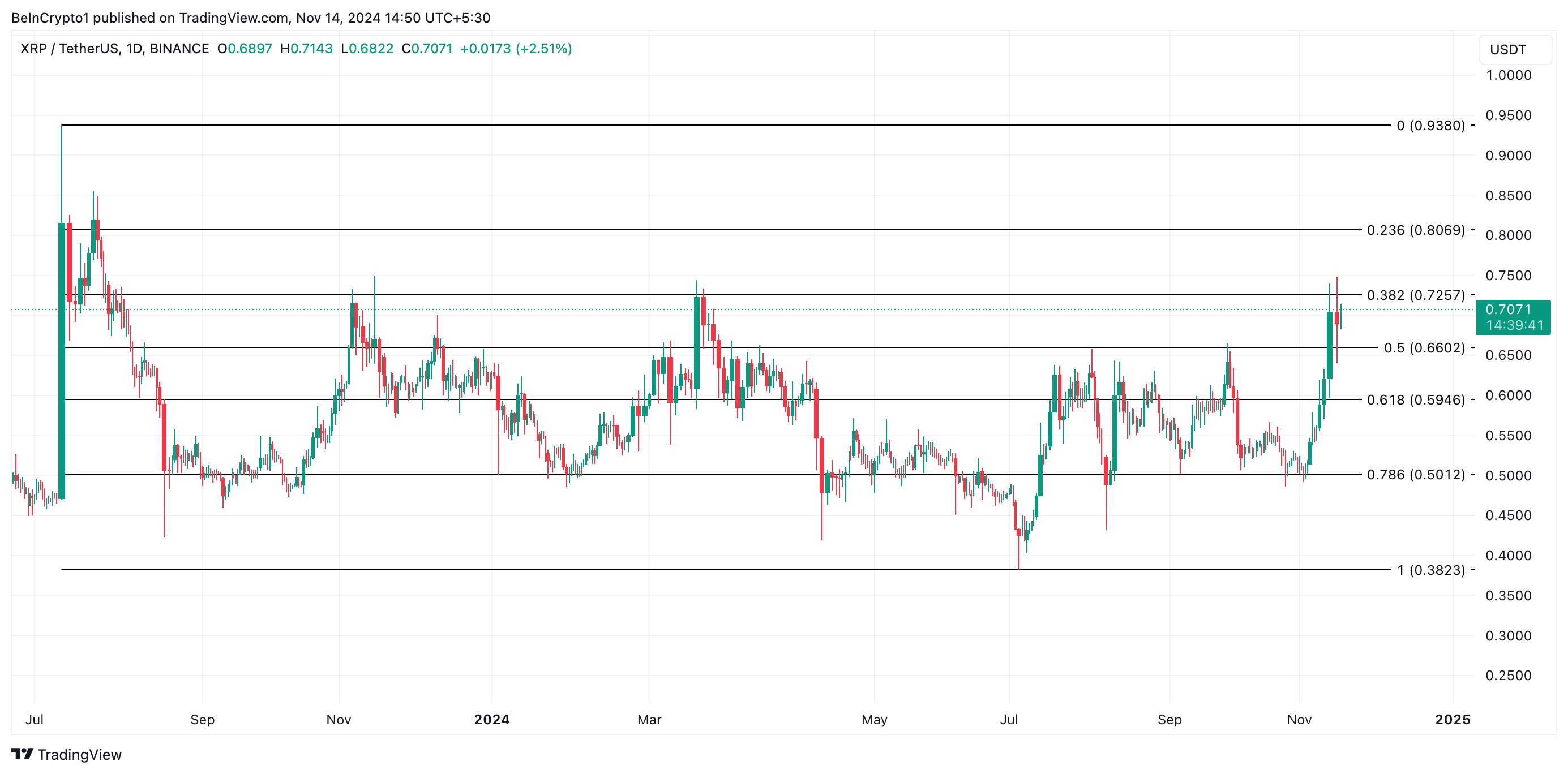 Ang XRP ay nagte-trade sa $0.70, bahagyang mas mababa sa antas ng paglaban na $0.72. Kung lumakas ang demand, maaaring malampasan ng token ang antas na ito at muling maabot ang bagong pinakamataas ngayong taon na $0.75. Ang matagumpay na paglampas sa puntong ito ay maaaring magtulak sa presyo ng XRP sa $0.80, isang taas na huling nakita noong Hulyo 2023.