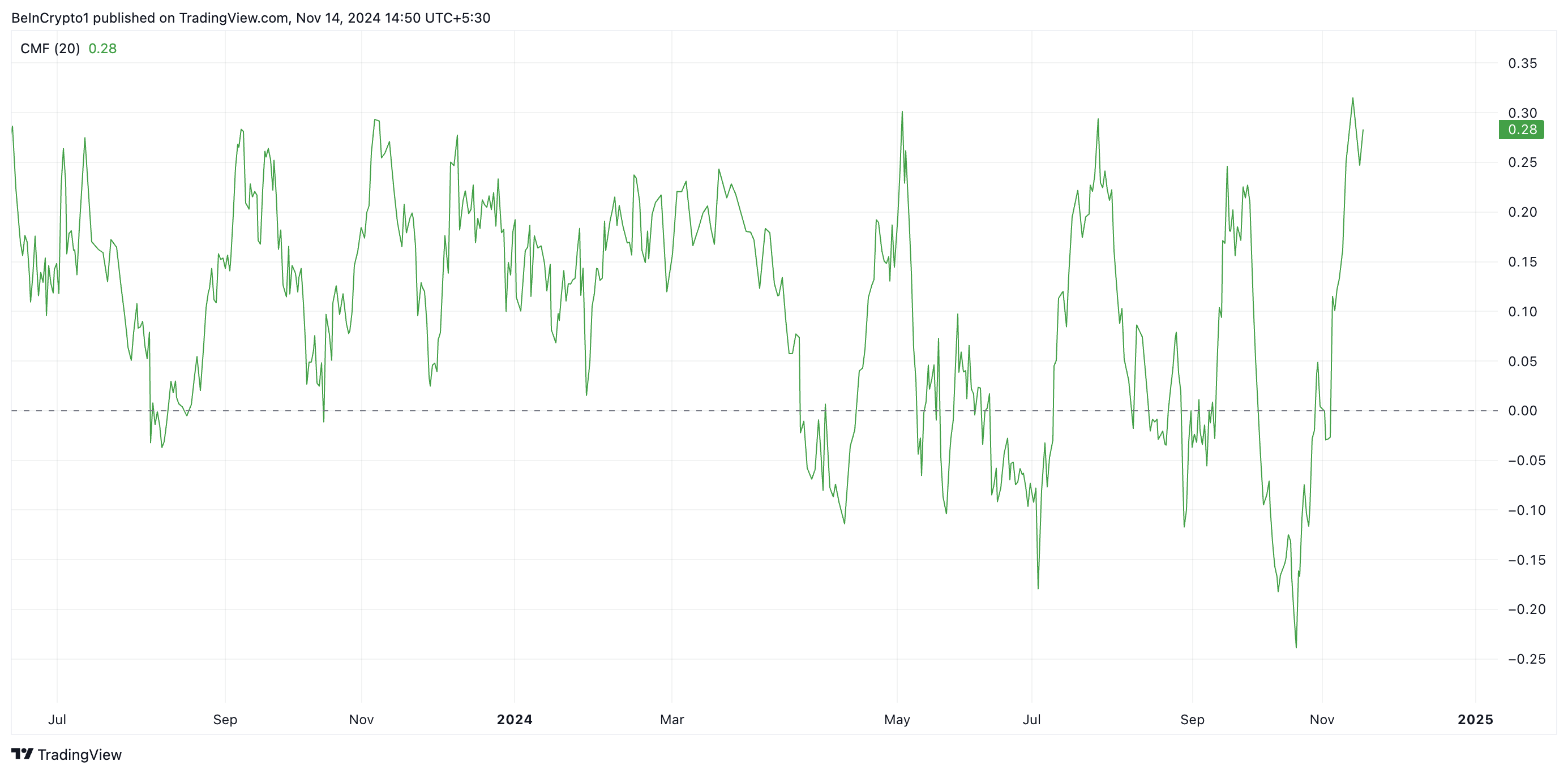 Bukod pa rito, ang tumataas na Chaikin Money Flow (CMF) ng XRP ay nagpapahiwatig ng lumalakas na demand para sa altcoin. Sa kasalukuyan, ito ay nasa 0.28.