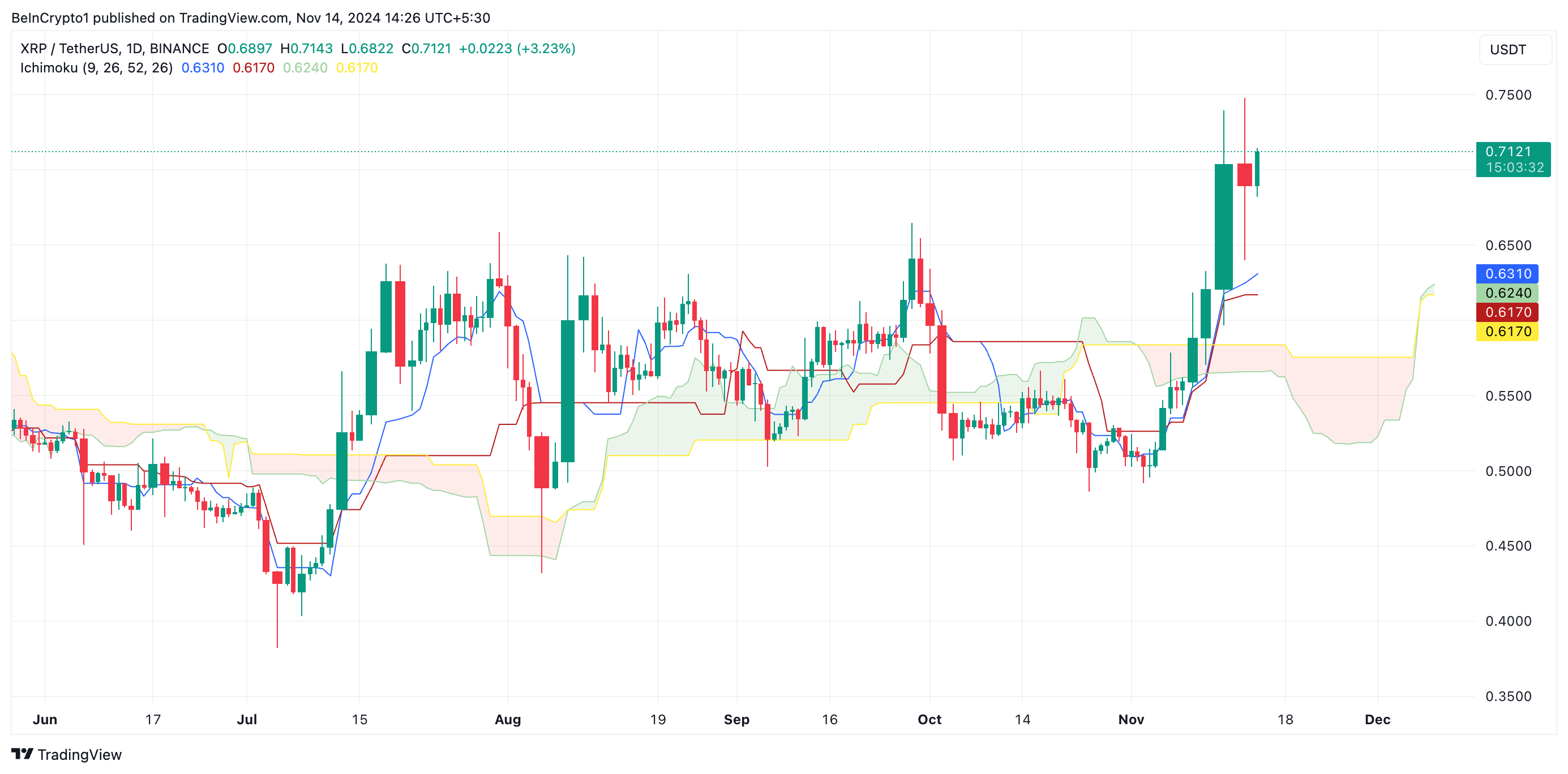 Sa kasalukuyang presyo nito, ang XRP ay nagte-trade na mas mataas kaysa sa Ichimoku Cloud nito. Ayon sa pagsusuri ng BeInCrypto ng one-day chart ng XRP/USD, ito ay maaaring ang unang matagalang rally na mas mataas sa cloud sa loob ng mahigit isang buwan.