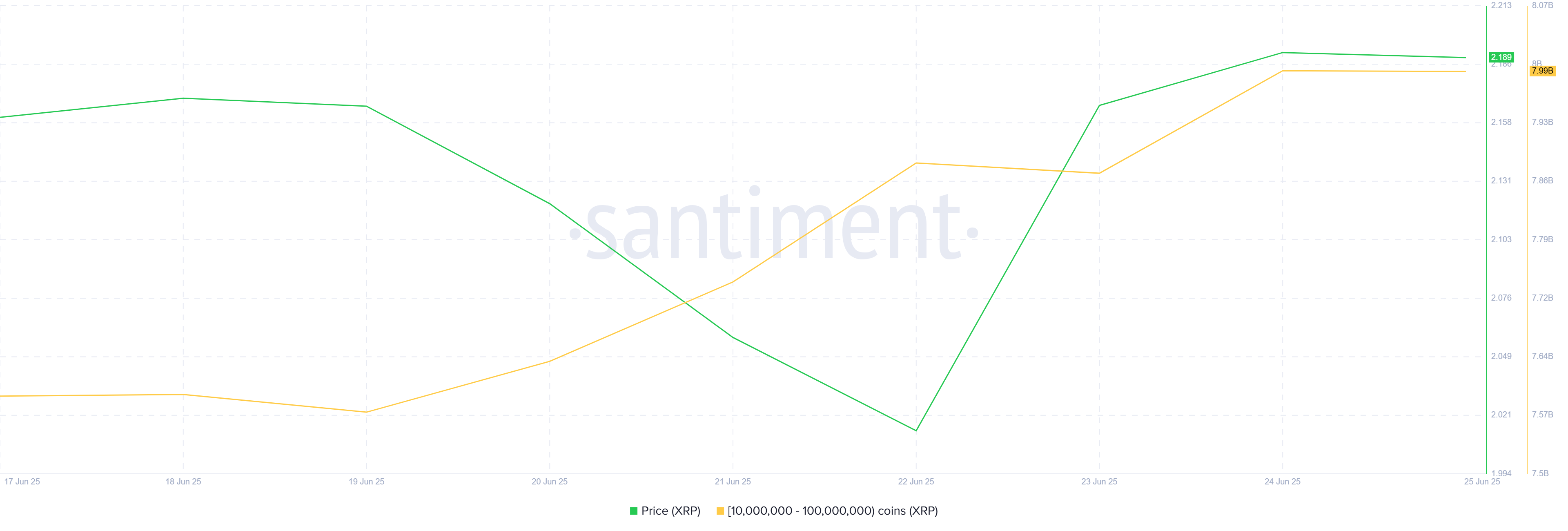 Noong nakaraang linggo, malakas na nag-accumulate ang mga XRP whales, nagpapakita ng matibay na paniniwala sa future recovery ng token. Ang mga address na may hawak na nasa pagitan ng 10 million at 100 million XRP ay nagdagdag ng mahigit 420 million XRP, na umabot sa higit $915 million sa mga pagbili.