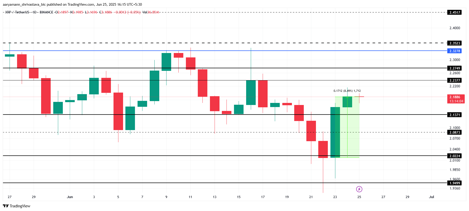 Tumaas ng 8.4% ang presyo ng XRP sa nakalipas na 48 oras, kasalukuyang nasa $2.18. Dahil sa malakas na suporta ng mga whale, pwedeng magpatuloy ang momentum na ito sa malapit na panahon. Kung magpapatuloy ang pag-accumulate ng mga whales at maging positibo ang market sentiment, maaaring magpatuloy ang pagtaas ng XRP, na may $2.23 bilang susunod na key resistance level.