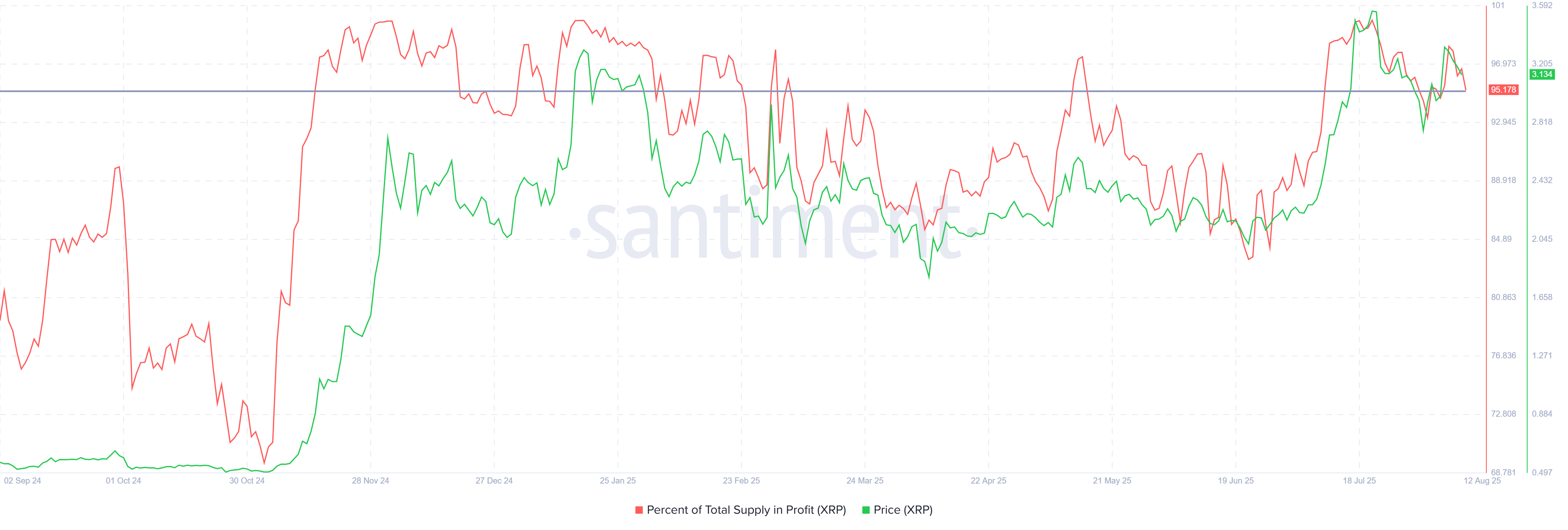 Sa ngayon, nahaharap ang XRP sa posibleng market top, kung saan mahigit 95% ng circulating supply nito ay nasa kita. Historically, kapag ganito kalaki ang porsyento ng supply na nasa kita, madalas na nagkakaroon ng market top na karaniwang nagiging senyales ng reversal.